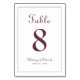 Wedding Table Number event party sign design features a classic elegance with contemporary burgundy on a crisp white background. Personalize wedding table design with your name, wedding date and table number in trendy lettering and script. The back of the card is a duplicate of the front. Follow our easy to use modern template to easily customize and order one for every table with your individual table numbers. ******This template made need to be adjusted with the design tool to visually center double digit table numbers ten and greater. ***** Contact us at invitationsuites@gmail.com or using the message link in this listing if you have questions, need assistance or have a custom color request for this design.