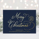An elegant dark blue corporate holiday card that features your company logo (upload a black version for best results) "Merry Christmas" showcased in a stylish calligraphy script and your business name in classic serif typography, all rendered in your choice of genuine gold, silver or rose gold foil. On the back, upload a white or light colored version of your logo, personalize your seasonal greeting and message of customer appreciation, and add your website or other information if desired.