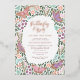 This gorgeous baby shower invitation features a detailed butterfly garden frame, which includes various flowers and greenery elements in shades of green and delicate pastel colors of pink, purple, coral peach, mint, and aqua. Real gold foil accents add a touch of elegance and class. Stylish typography reads, "Butterfly Kisses and sweet baby wishes." The back of the card is left blank/white, but the color can be customized, if desired.