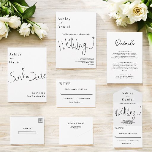 This elegant black and white wedding invitation is perfect for a modern wedding. The simple design features elegant black calligraphy on a clear acrylic background.