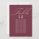 Burgundy wedding table seating card with elegant calligraphy and editable typography. Simple, modern minimalist design to suit your wedding colors. Table is lettered in handwritten script and the template is ready for you to edit the table number and your guest seating list.