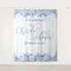 Pretty dusty blue and white Photo Booth Backdrop for your bridal shower. This custom design features elegant calligraphy and watercolor floral arrangements of flowers and foliage in shades of blue. The template is set up for you to personalize with the bride to be's name and occasion date. Bridal Shower is hand lettered in swirly calligraphy. Please browse my store for coordinating invitations, signs and labels.