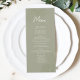 A simple minimalist wedding reception menu card template. This design features a wedding reception menu table card, a botanical tropical beach destination, a coastal island greenery foliage, with eat and drink dinner menu, a main course dessert salad soup, with green sage simple minimalist, a modern contemporary design style, a trendy stylish calligraphy script, a creative boho floral style, a custom monogram back side