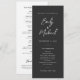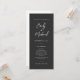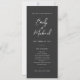 Our elegant slim wedding program card is perfect for your minimalist wedding celebration. A beautiful white calligraphy font paired with simple and clean text sits on a soft dark grey background to the front of the card. The white reverse has tonal black text which creates a chic, elevated look to complement your stylish event. Easy and quick to customize yourself with your own wedding details.