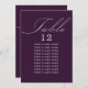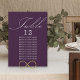 Purple wedding table seating card with elegant calligraphy and editable typography. Simple, modern minimalist design to suit your wedding colors. Table is lettered in handwritten script and the template is ready for you to edit the table number and your guest seating list.