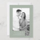 Announce your wedding with this modern and elegant save the date card, designed to captivate your guests with its timeless charm. "Save the Date" is displayed vertically on the left side in graceful white calligraphy against a soothing sage green background, creating a sophisticated and natural aesthetic. Your vertical engagement photo is beautifully positioned on the right, adding a personal and stylish touch to the design. Personalize the card with your names, wedding date, and location in bold white lettering for a polished and cohesive look. The back of the card includes space for an additional photo, along with your wedding website and a convenient QR code to effortlessly share event details. Perfect for couples seeking a simple yet refined announcement, this design sets the tone for a truly memorable celebration.