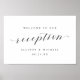 Simple Elegant Calligraphy Script Wedding Reception Welcome Sign in beautiful flowing fancy letters and your personalized text. A stylish yet simple formal design in black and white or any background color you choose. Just click the customize further link, shown under the text personalization area on the right, and choose your custom color background. This sign poster template makes it fast and easy to create stunning additions to your wedding decor. Signs can be enlarged, there are many sizes to choose from, as well as options for custom framing and matting. Welcome custom signage.