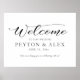 Elegant white wedding welcome sign with a beautiful calligraphy script font "Welcome to our wedding". Personalized with the names of the bride and groom and their wedding date, along with a special message to guests at the bottom.