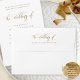 Elegant white wedding envelope with phrase "The Wedding of" on back to flap in graceful modern handwritten calligraphy customized with couple's names. Front with area for return address information, which if you prefer envelope without it, it can get deleted by erasing characters from its corresponding text boxes. White exterior and interior background color, which you can change to any other color you like by selecting "customize further" and changing color on big rectangular shapes covering the "unfolded" interior or exterior areas. Note: typography is not in real foil, but rather print in a golden hue. Part of our "Elegant Calligraphy Minimalist Wedding" collection.