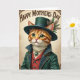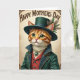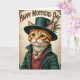 This card features a human-like ginger tabby cat facing forward, its soft striped fur carefully detailed and its large green eyes holding a tender, friendly gaze ❤️. The cat wears a deep emerald top hat trimmed with matching feathers, giving it a polished, old-fashioned look. An emerald overcoat with gold edging frames deep blue patterned lapels, like something chosen for a special day. Underneath sits a crimson waistcoat with small teal star-shaped buttons that add a sweet, affectionate touch. Around its neck is a double strand of pearls with a gold pendant set with an oval teal gem, catching the light like a cherished keepsake. Near the top, the words “Happy Mothers Day” appear in dark green decorative lettering, centered above the cat against a parchment-toned background 🌼. The border is filled with antique-style scrollwork and delicate corner flourishes in warm brown and faded gold.