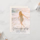 A modern, minimalist full photo funeral invitation to celebrate the life of your loved one in a minimalist clean simple design style featuring a elegant handwritten script font and a soft pastel peach background. The design template can easily be personalized with your own photo and text to create a special tribute for your loved one's funeral, memorial or celebration of life. The image shown is for illustration purposes only to be replaced with your own photo. The placeholder image shows a happy young woman with wavy long blonde hair wearing an elegant chic pastel floral summer dress standing in the sea at sunset on a sandy beach in the shallow breaking waves. #funeral #invitation