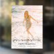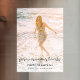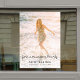 A modern, minimalist full photo funeral vinyl window cling decal sing to celebrate the life of your loved one in a minimalist clean simple design style featuring a elegant handwritten script font and a soft pastel peach background. The design template can easily be personalized with your own photo and text to create a special tribute for your loved one's funeral, memorial or celebration of life. The image shown is for illustration purposes only to be replaced with your own photo. The placeholder image shows a happy young woman with wavy long blonde hair wearing an elegant chic pastel floral summer dress standing in the sea at sunset on a sandy beach in the shallow breaking waves. #funeral #decor