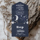 This all-in-one wedding invitation beautifully encapsulates the elegance and mystique of a celestial-themed celebration, featuring a sophisticated crescent moon as its central design element. The crescent moon, adorned with intricate gold foil detailing, is set against a deep navy or midnight blue background, reminiscent of a serene night sky. Scattered gold foil stars add an extra touch of magic, creating a dreamy, romantic atmosphere.
