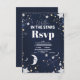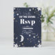 The RSVP details are presented in a combination of modern calligraphy and classic serif fonts, embossed in luxurious gold foil to match the celestial elements. The card offers a clear and organized layout for guests to respond, with options for accepting or declining the invitation, along with space for any dietary preferences or special requests.