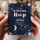 This elegant RSVP card perfectly complements a celestial-themed wedding, featuring a refined crescent moon design as its central element. The crescent moon, adorned with intricate gold foil accents, is set against a deep navy or midnight blue background, reminiscent of a tranquil night sky. Scattered gold stars twinkle around the moon, adding a touch of magic and sophistication.