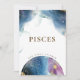 Enjoy a celestial constellation theme with our constellation table signs. Pisces constellation table name card with exquisite watercolor stains and celestial globe map with constellations on the front. The back with a beautiful watercolor galaxy design with the Pisces constellation in the center. Design with blue, navy, turquoise, purple, magenta, fuchsia, and golden watercolor hues. Part of a collection with many constellation table name cards available, as well as table seating chart cards, seating plan signs, menus, and more. If you need any other constellation name not available on our collection set, please feel free to change the name using the table text box provided, so you can complete your set.