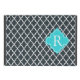 Elegant, classic, modern deep charcoal, black quatrefoil pattern with aqua blue decorative shape monogram, initial, name or text.