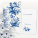 Classic and elegant blue and grey flowers, vines and leaves on antique white background. Back features complementary floral graphic and editable text fields.
