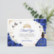 Royal blue, gold and white Quinceanera thank you card. Features brunette girl in ball gown dress, script font, gold butterflies, royal blue roses and tiara. Perfect for an elegant princess style glam celebration. Personalize with your own details.