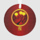 Celebrate the Chinese New Year with a this elegant design featuring a red patterned background and a gold circle with gold lanterns, a tree silhouette with a monkey, and the lettering for monkey.