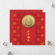 Golden Rabbit paper-cut into a golden circle with "Year of the Rabbit" + "Happy Chinese New Year" in English and Chinese (calligraphy) on a decorated red pattern background. Design on square flat card. Perfect for Chinese New Year of the Rabbit 2023.