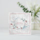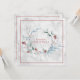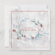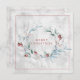 A delicate nature-inspired holiday card in a square shape with a watercolor painted wreath in wispy teal green shades with red berries scattered throughout. A snowy textured background adds to the winter theme. The text template includes a Merry Christmas greeting on the outside and a sample message inside the card. All of this text can be personalized with your desired text, or you may leave as written.