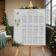 This lovely winter botanical seating chart features bouquets of ivory roses and flowers, red holly berries, fir and golden snowflakes surrounding an elegant gold label for your monogram on a pale pearl grey background. Includes editable text fields. Template includes 12 blocks of 10 names for a total of 120 names.