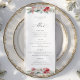 These elegant winter Christmas floral wedding menu cards feature festive watercolor bouquets of flowers and greenery at the top and bottom.