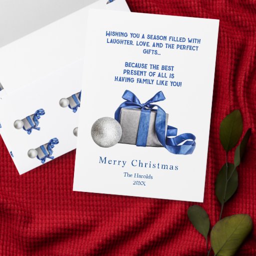 Elegant Christmas Gift Box with Blue Ribbon Holiday Card