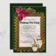 Christmas Tea Party invite featuring red pointsettia, gold and white tea set, and ornate gold frame. Reverse has same rich green background color with single pointsettia which is a scalable and moveable design element. Fully editable to suit.