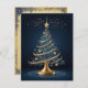 This beautifully designed Christmas card features an elegantly decorated Christmas tree with golden ornaments and lights, topped with a shining golden star. The tree stands prominently against a dark background with subtle leaf patterns and small golden stars hanging around it. At the bottom, "Merry Christmas" is written in elegant golden script. The front of the card captures the festive spirit with its intricate and festive design. On the back, the card features a vintage-style blank page with decorative patterns, providing ample space for writing a personal and heartfelt message. Perfect for sending warm holiday wishes to loved ones.