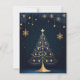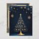 This beautifully designed Christmas card features an elegantly decorated Christmas tree with golden ornaments and lights, topped with a shining golden star. The tree stands prominently against a dark background with subtle leaf patterns and small golden stars hanging around it. At the bottom, "Merry Christmas" is written in elegant golden script. The front of the card captures the festive spirit with its intricate and festive design. On the back, the card features a vintage-style blank page with decorative patterns, providing ample space for writing a personal and heartfelt message. Perfect for sending warm holiday wishes to loved ones.