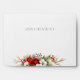 This romantic and classic Christmas or winter-themed wedding envelope design features clusters of vibrant red and white winter flowers, pine, holly berries and rustic twigs, custom modern text graphics and editable text fields.