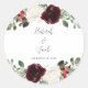 These elegant Christmas winter wedding stickers are perfect for wedding reception favors. Coordinating stickers compliment your wedding reception, rehearsal dinner, or bridal shower. The design features beautiful watercolor white and burgundy florals with pine, holy berry and eucalyptus greenery. This is a perfect color scheme for a winter wedding. Make this sticker your own by including your names and your wedding date.
