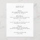 Elegant black and white wedding menu featuring a simple and minimal design with the title in a traditional serif font and the course headers in an elegant calligraphy script. A classic style that is perfect for a formal wedding.
