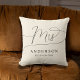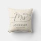 The design shows an elegant minimalist throw pillow in black and creme. A beautiful unique "mrs" text in whimsical calligraphy at the top and a customizable surname and date at the bottom. The design is extremely unique and classic and will be an elegant item to give any bride or newlywed as a gift.