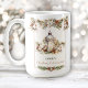 White and cream hot cocoa or chocolate Christmas Large Coffee Mug in classic but modern farmhouse style adorned with pine, white Christmas flowers, lantern and a cute bird. Easily personalize the text - Kate Eden Art