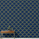 Elegant Nautical and Coastal theme Golden shell pattern on deep blue wallpaper.