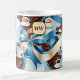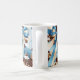 This coffee mug features a stylish and vibrant design that blends coffee-inspired elements with a refined aesthetic. The artwork includes steaming coffee cups, coffee beans, and rich details like latte art. These motifs are set against a background of soft blue and gold tones, giving the design a fresh and elegant look. A large, decorative blue ribbon with gold accents wraps through the design, adding a luxurious touch. The centerpiece is a monogram framed in gold, which can be customized with initials, making this mug an ideal personalized gift or a standout piece for coffee enthusiasts.