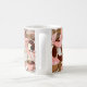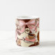 This coffee mug features a charming and elegant design centered around a coffee theme. The artwork includes a steaming cup of coffee on a saucer, surrounded by soft pink bows, coffee beans, and rich brown tones that evoke warmth and comfort. The background has a cream-colored base that contrasts beautifully with the darker coffee hues. A customizable monogram with the initials “MW” is prominently displayed in the center, adding a personal touch. The overall aesthetic is sophisticated yet cozy, making it perfect for coffee enthusiasts or as a thoughtful gift.