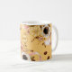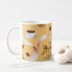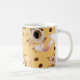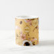 This coffee mug features a warm yellow background adorned with delicate floral designs, accented by scattered coffee beans and soft pink ribbon elements. The central focus of the design is a customizable monogram, framed in an elegant gold border, adding a touch of personalization and sophistication. The artwork also includes steaming coffee cups nestled among the flowers and ribbons, enhancing the cozy and inviting theme. This mug is perfect for coffee enthusiasts who appreciate a stylish and customizable design.