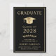 Elegant black college graduation announcement featuring a gold graduation cap and simple modern gold typography for the graduate's name, class year, college or university, degree and major or honors.