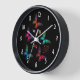 A clock Designed with an elegant pattern with a graphic illustration of fluttering butterflies in many bright colors. Whimsical florals, sprigs and leaves add a bit of charm.