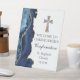 Modern navy blue and gold agate decorate this elegant confirmation welcome pedestal sign for your Christian ceremony celebration. Customize with a name under the cross for a beautiful religious print for a Methodist or Catholic church party.