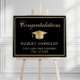 Elegant black graduation party foam board welcome sign and photo prop featuring a gold grad cap, "Congratulations" in a classic calligraphy script and the graduate's name, school and class year in modern typography.
