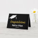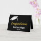 This black and white graduation card has a white graduate's cap in the upper left corner. Display text says 'Congratulations' in faux gold script. Customize the card with the graduate's name in white text. You can even add the class of year under the name. There's a message inside and a place to add the graduate's name and the sender's name inside.