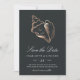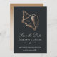 Notify guests of your upcoming destination, beach, or tropical island wedding with these beautiful summer save the date cards featuring a faux copper foil conch shell illustration on a rich, soft black background. Elegant white script and block lettering displays your wedding details (names, wedding date, location, and website).