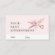 Modern and elegant appointment card for hairstylists with faux copper rose gold scissors, pink and white roses and elegant calligraphy font.
