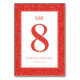 This elegant wedding table card features a bold, coral-colored number "8" centered on a clean white background, surrounded by intricate leaf-like patterns in a matching red hue. The design combines modern minimalism with subtle sophistication, using crisp lines and solid colors for a polished look. Delicate script typography adds an elegant touch above the numeral, while simple sans-serif fonts provide clarity for customizable details below. Perfect for adding a chic and contemporary feel to your wedding reception, this card is designed to create an atmosphere of understated luxury.