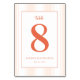 This elegant wedding table card features a minimalist design with a large, bold number "8" at the center, framed by soft peach vertical stripes. The color palette includes coral orange text on an off-white background, creating a warm and inviting atmosphere. The layout is clean and sophisticated, with ample white space enhancing readability and visual appeal. Customizable elements allow for personalization with names and dates, making it perfect for adding a touch of refinement to your special day.